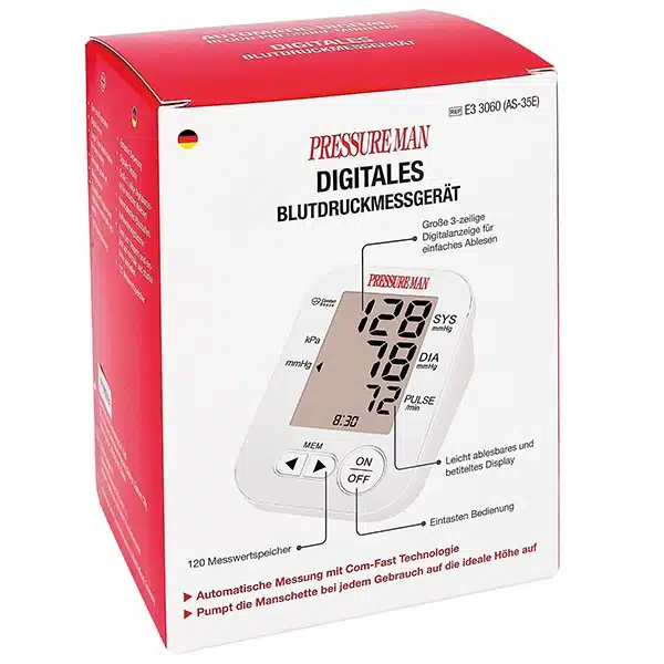 De volautomatische digitale bloeddrukmeter model Pressure Man is een nauwkeurige bloeddrukmeter voor een snelle, eenvoudig betrouwbare bloeddrukmeting. De bovenarm bloeddrukmeter geeft volautomatische, nauwkeurige metingen aan en is eenvoudige met รฉรฉn knop te bedienen