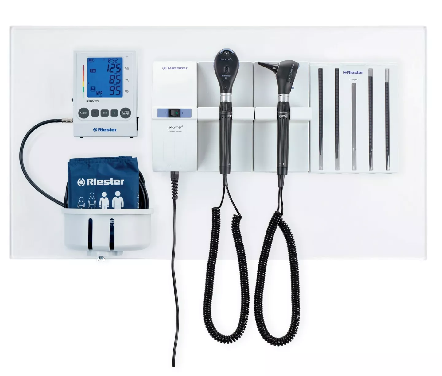 Flexibel en modulair wand diagnosestation van Riester. Het station biedt vele configuraties om te voldoen aan de behoeften van ziekenhuizen, medische praktijken en klinieken. Het biedt de zorgverlener de mogelijkheid om de ogen, oren, neus, tong en huid van hun patiënt te beoordelen, waardoor het geschikt is voor gebruik in KNO en dermatologie. Het wandmodel is ontworpen om aan de muur te worden bevestigd. Het wordt geleverd met een keuze uit 1 of 2 handgrepen en bevat een wandmontageplaat, pluggen en schroeven.