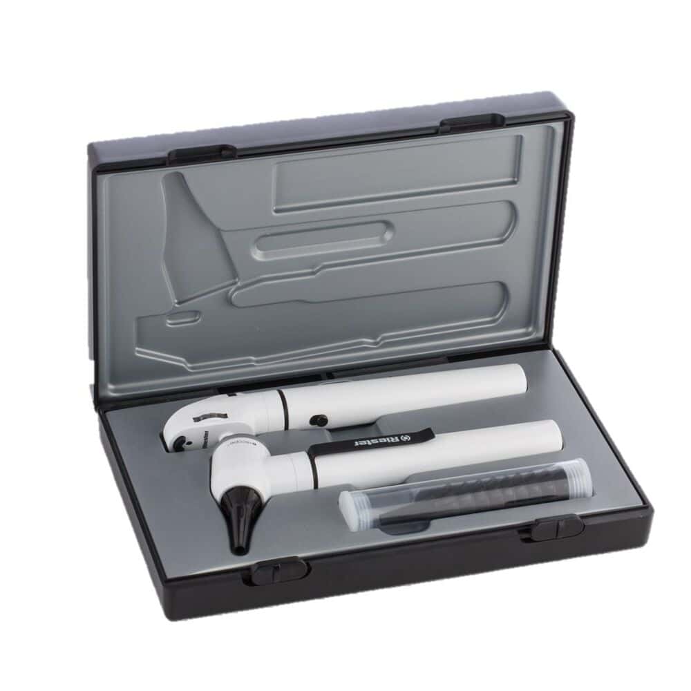 Riester e-scopeยฎ set, bestaande uit een otoscoop en een ophtalmoscoop. Beide maken gebruik van 3,7V LED verlichting. Ze zijn licht van gewicht en hebben een perfect formaat om de hele dag in uw zak te dragen. De handgrepen zijn van AA-formaat voor gebruik met alkalinebatterijen (apart verkrijgbaar) en zijn voorzien van een penclip om hem gemakkelijk op zijn plaats te houden. De set wordt geleverd in een slagvaste koffer.
