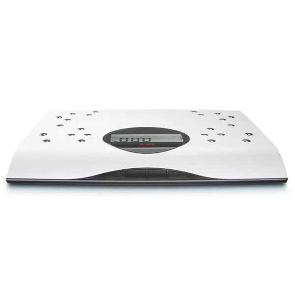 Het ongebruikelijk hoge aantal chroomelektroden laat zien wat deze weegschaal kan: naast gewicht meet hij ook lichaamsvet en lichaamsvocht en berekent hij de BMI. Het herkent elke gebruiker automatisch na de eenmalige invoer van leeftijd, geslacht, lengte en fitnessniveau.