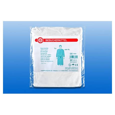 De bezoekersjas, is gemaakt van non-woven. De lange jas is open aan de achterkant, heeft lange mouwen en een elastische band om de pols. Met banden in de taille en kraag wordt de jas vastgemaakt. Door het ademende materiaal is het product zeer comfortabel om te dragen. Het wordt gebruikt in gevoelige gebieden (intensive care-afdelingen) om de overdracht van ziektekiemen van de bezoeker op de patiรซnt te verminderen.