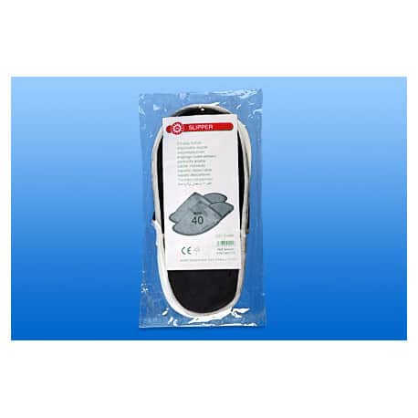 Wegwerpschoen, in instapvorm voor patiรซnten. Het is verpakt in paren en bestaat uit een blauw non-woven materiaal en een zool gemaakt van EVAC. Het product wordt gedragen in medische voorzieningen zoals ziekenhuizen en dagklinieken en voorkomt de verspreiding van contaminatie.
