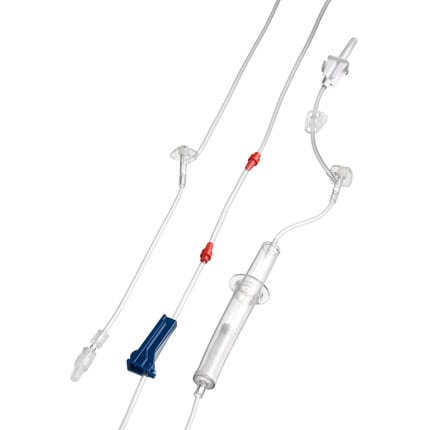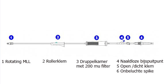 Medisize toedieningssysteem bestemd voor infusie en transfusie. Beschikt over een onbeluchte spike, 1 naaldloze bijspuitpunt, een druppelkamer, 200 ยตmm filter en rotating male Luer Lock.