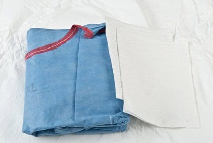De blauwe operatie jas is individueel steriel verpakt en bestaat uit een spunlace non-woven stof met een laag deeltjesgehalte, bestaande uit een mengsel van cellulose en polyester.