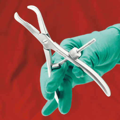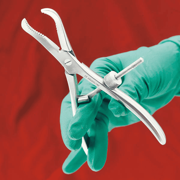 Deze herpositioneringstang word gebruikt bij orthopedische operaties. De tang bestaat uit vingerringen met ratel en puntige uiteinden die helpen bij het positioneren van botfragmenten en ze stevig op hun plaats te houden tijdens de behandeling van fracturen.
