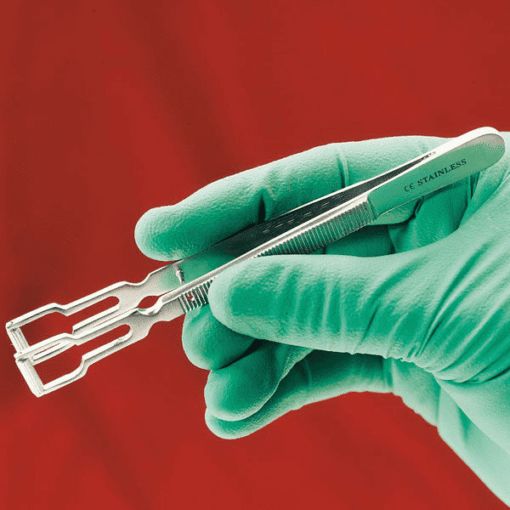 Rollende pincet voor het uitpersen van de trachomakorrels volgens KNAPP: op de uiteinden van de pincet, circa 3 mm brede en 1ยฝ mm dikke rollen, dwars op de lengteas beweegbaar, waartussen het deksel wordt aangedrukt en uitgerold nadat de korrels zijn vooraf doorboord.