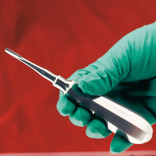 Wortelelevator met gebogen werkeinde. Dankzij de sierlijke vorm zijn zelfs moeilijk bereikbare plaatsen gemakkelijk te bereiken. Het werkende uiteinde, in de vorm van een guts, zorgt ervoor dat de longblaasjes voorzichtig worden vrijgemaakt. De wortelelevator zorgt voor een veilig gebruik dankzij de holte van de duim op het handvat.