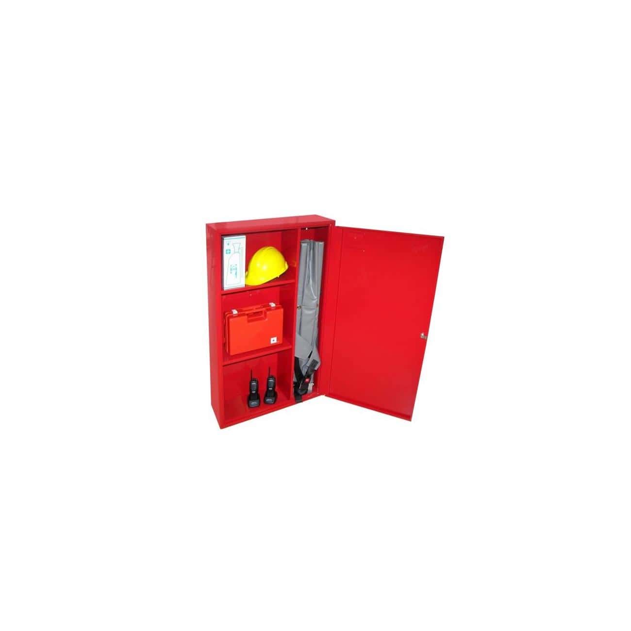 BHV kast. Deze stalen BHV kast biedt u voldoende ruimte voor het opbergen van uw BHV materialen zoals BHV verbandkoffer, helm, megafoon, afzetband etc, De legplank is verstelbaar. De BHV kast heeft bergruimteย voor en dubbel opvouwbare brancard