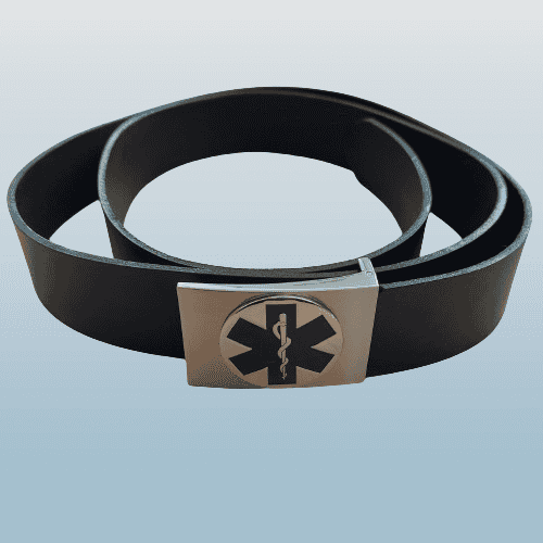 EHBO riem met Star of Life gesp. De riem heeft een standaard (maximum) lengte van 140cm en is gemakkelijk op maat te maken, door de riem in te korten. Daarna kan de gesp, die los wordt meegeleverd, eenvoudig aan de riem worden bevestigd.