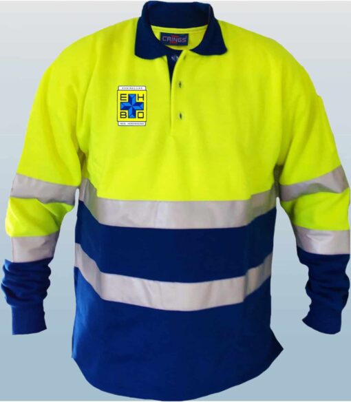 Deze comfortabele EHBO polosweater is gemaakt van 65% katoen en 35% polyester in de kleuren geel en blauw, met 3M kwaliteit striping over de buik en rug voor een optimale zichtbaarheid.