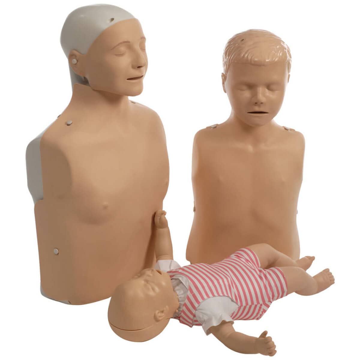 Het pakket vanย drie oefenpoppen is ontwikkeld om op realistische wijze de anatomische verschillen van volwassene, kind en baby te kunnen weerspiegelen. Met de Family Pack van Laerdalย kunt u de cursisten de verschillen uitstekend laten zien en daarbij de cursisten de verschillende manieren vanย reanimatie aanleren. De Little Family Pack van Laerdal wordt compleet geleverd met een Family Pack tas voorzien van wielen waarbij alle drie de reanimatie oefenpoppen ook nog in hun individuele verpakking zitten.Specificaties