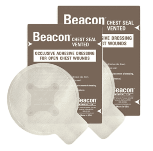 De Beaconโข Chest Seal is een geavanceerd afsluitend wondverband dat is ontworpen om open borstwonden te behandelen. De Chest Seals zijn speciaal ontworpen met een hydrogellijm van medische kwaliteit die sterk genoeg is om zich te hechten aan een huid die wordt blootgesteld aan bloed, zweet, haar, zand of water.