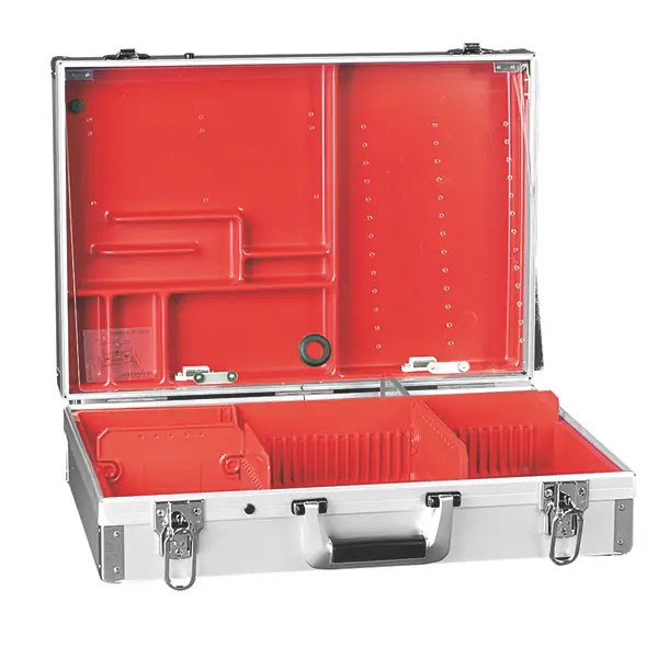 II heeft een variabele compartimentverdeling in het bovenste en onderste deel. Door verwijderbare ย tussenbladen kan de apparatuur van de noodkoffer individueel worden geplaatst.