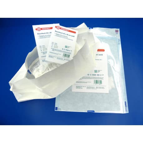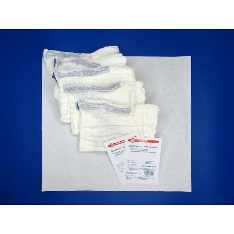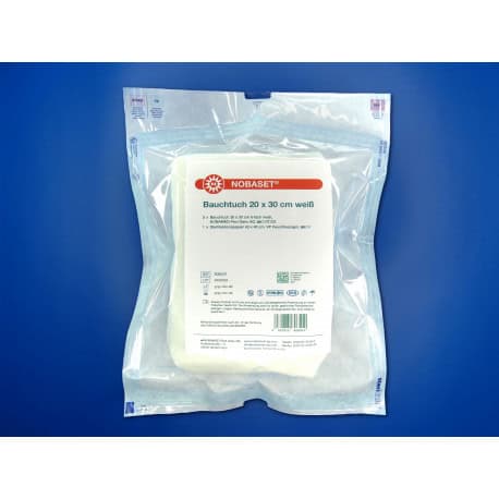 Dubbel verpakte voorgewassen witte laparotomiespons met rรถntgenchip en lus. De steriele set is verpakt in een papieren folieverpakking. In de binnen verpakking zitten 2 telkaarten. De sets zijn leverbaar in diverse afmetingen, lagen en aantallen verpakkingen
