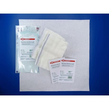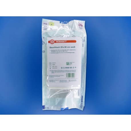 NOBAMED dubbel verpakte, niet voorgewassen witte laparotomie spons met röntgenchip en zonder lus. De steriele set is verpakt in een gesteriliseerde en vacuüm getrokken papieren folieverpakking, met in de binnenverpakking 2 telkaarten, welke zijn voorzien van een kleurcodering. Hierdoor is gemakkelijk te zien, welk product wordt gebruikt en dit vereenvoudigd de telling. De sets worden o.a. gebruikt op de OK.