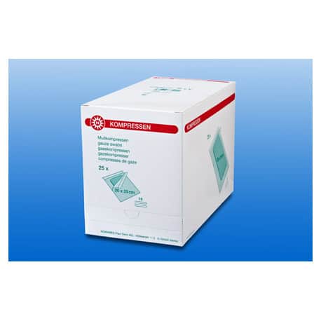 De katoenen 16-laags gaaskompressen van NOBAMED met naar binnen gevouwen, rafelvrije snijkanten zijn gemaakt van gaas dat voldoet aan de eisen van norm EN 14079 type 17. De gaaskompressen zijn zeer zacht en hebben een hoog absorptie vermogen. Ze worden met de gevouwen kant naar boven in de steriele zakjes geplaatst, zodat de kompressen gemakkelijk uit het zakje genomen kan worden. 25 Steriele gaaskompressen zijn individueel verpakt in een verzamelverpakking, die is voorzien van een handige uitneemgleuf.
