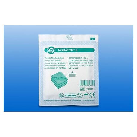 Het steriele 4-laags non-woven doekje is bindmiddelvrij vervaardigd en heeft het absorptievermogen van een 8-laags gaasdoekje. Het materiaal is zeer zacht en daardoor zacht voor de huid. NOBATOPยฎ-steriel 8 dient als wondafdekking.