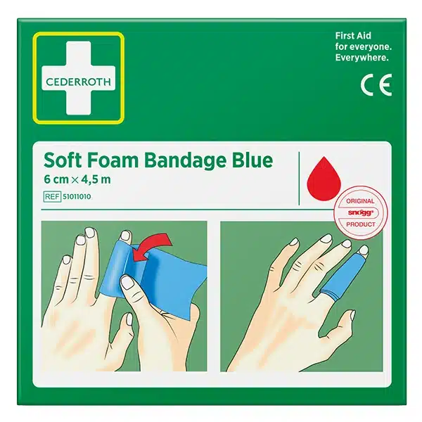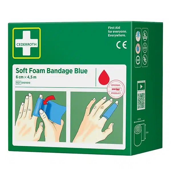 De blauwe Cederroth Soft Foam Bandage maakt het gebruik van verbandklemmen of pleisters overbodig. Dit latexvrije verband is zelfklevend zonder gebruik van lijm. Hierdoor plakt deze bandage niet aan huid of haar. Het elastische verband is geschikt voor alle typen kleine wonden en kan gebruikt worden als pleister én als verband. Het is snel en eenvoudig aan te brengen op vingers, handen, armen, benen, voeten en tenen. De Soft Foam Bandage is te gebruiken bij warmte, kou, natheid of droogte en blijft goed zitten.