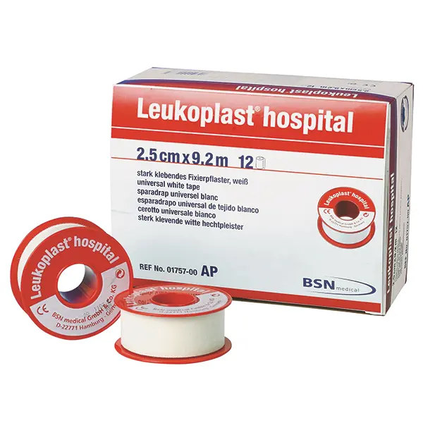 Een beproefde witte rolpleister van het merk BSN. Deze uitvoering is zonder beschermring en wordt dikwijls in ziekenhuizen en klinieken gebruikt omdat de pleister direct gebruikt kan worden zonder een beschermring te moeten verwijderen en afval reduceert..