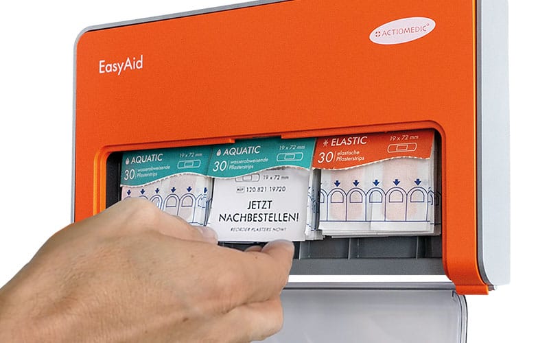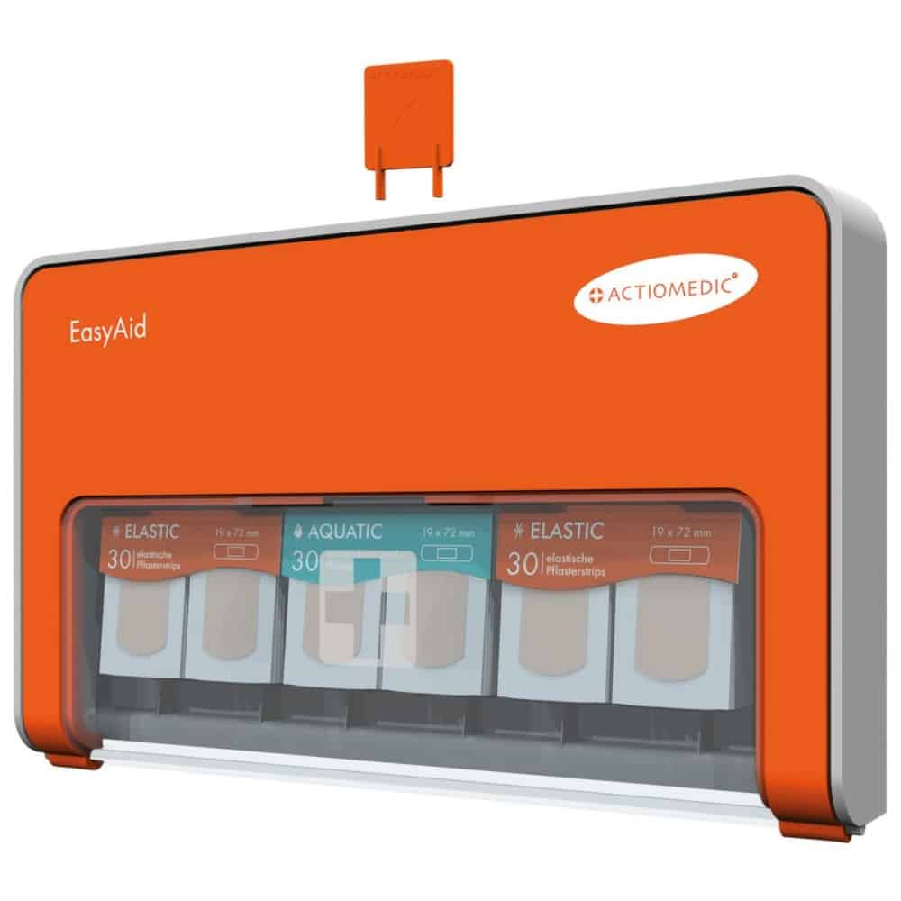Pleisterdispenser EasyAid voor kinderen. De EasyAid pleisterdispenser van ACTIOMEDIC kenmerkt zich vooral door zijn bewegingsvrijheid en het slimme ontwerp. Dit betekent dat de inhoud altijd goed beschermd is en de pleisters netjes en gemakkelijk kunnen worden verwijderd. De zeer goed zichtbare oranje dispenser heeft een volledig ingesloten behuizing en biedt hierdoor bescherming tegen stof, vuil en spatwater. Het biedt ruimte voor maximaal drie (verschillende) pleistertypes, welke verkrijgbaar zijn in diverse maten en materialen. Een pleister kan gemakkelijk (met รฉรฉn hand) verwijderd worden, door de pleister naar beneden uit de dispenser te trekken. Op deze manier ontstaat er geen verontreiniging aan de resterende pleisters of de dispenser, door vuil of druipend bloed. Verder beschikken de pleister vullingen over een slim Kanban-systeem. Dankzij dit systeem wordt ervoor gezorgd dat u tijdig herinnert wordt om nieuwe navullingen te bestellen en dus nooit misgrijpt. De dispenser kan eventueel geactiveerd worden tegen diefstal. Eenmaal geactiveerd, is openen van de behuizing alleen nog maar mogelijk met de bijpassend meegeleverde sleutel. De pleisterdispenser kan gemakkelijk zowel met schroeven als met plakstrips aan de wand worden gemonteerd. Heeft u een EasyAid pleisterdispenser met een andere inhoud nodig? Bekijk hier alle beschikbare uitvoeringen! Wilt u losse navullingen (bij)bestellen, klik dan hier.