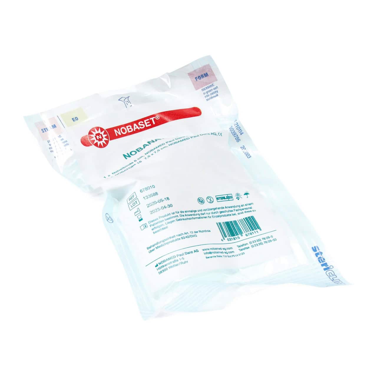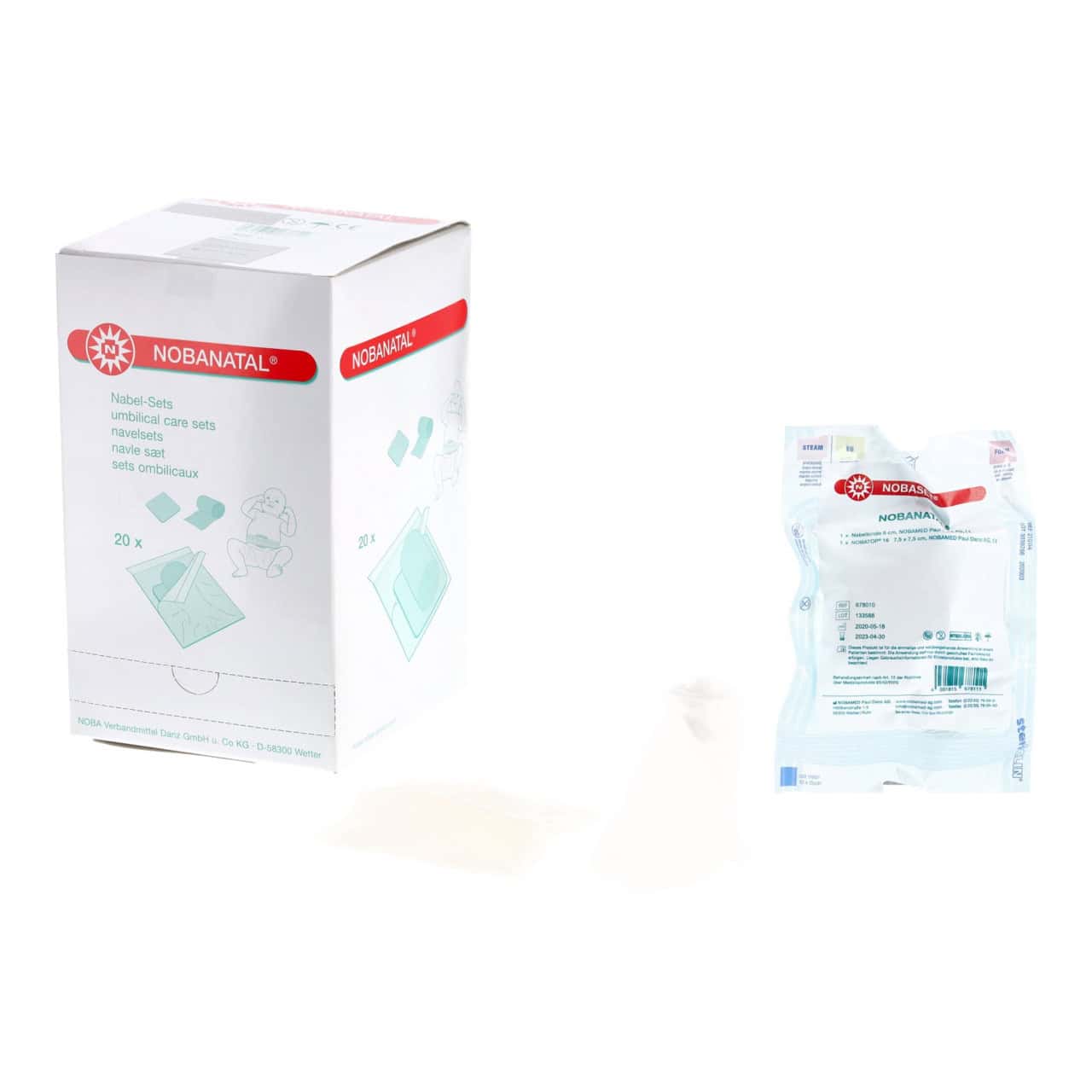 Deze set wordt gebruikt voor de eerste verzorging van de navelstomp van een pasgeborenen. De set bestaat uit een steriel procedurepakket met navelklem, twee nonwoven wattenstaafjes met en zonder spleet en navelverband gebruikt. Het elastische navelverband wordt in de lengte gebruikt om de navelstomp tussen de wattenstaafjes te bedekken. De set bestaat uit: -2x Wondkompres NOBATOPยฎ 12 7,5 x 7,5 cm -2x Wondkompres NOBATOPยฎ S 7,5 x 7,5 cm 6-delig -1x Navelklem -1x Navel zwachtel 6 cmSpecificaties