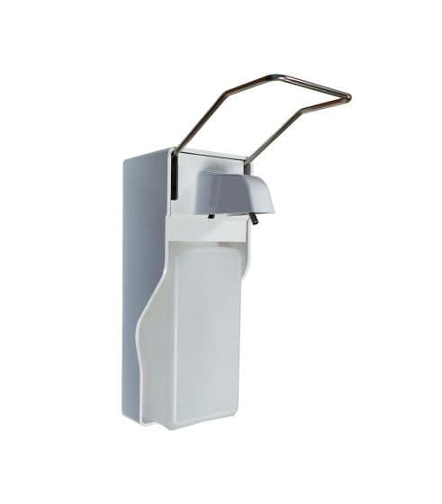 Elleboog dispenser handdesinfectie โ handzeep. Deze desinfectie dispenser kunt u zelf vullen en is geschikt voor handdesinfectie & handzeep. De inhoud van de fles bedraagt circa 1 liter. De dispenser kan met de hand OF elleboog worden gebruikt. De dispenser wordt zonder desinfectie middel geleverd, deze dient separaat te worden besteld.