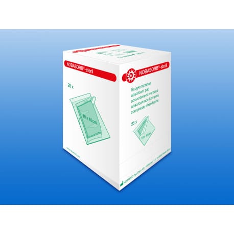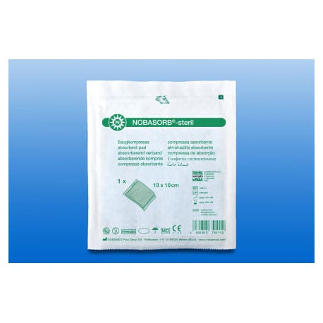 Het sterk absorberende NOBASORB wondverband van NOBAMED heeft een vloeistofdichte blauwe non-woven rug. Het is gevuld met een sterk absorberende kern en wordt gebruikt voor sterk exsuderende, geรฏnfecteerde of chronische wonden. Het wordt ook gebruikt bij exsuderende wondgenezingsstoornissen. De absorberende verbanden zijn individueel steriel verpakt en er zitten 25 verbanden in รฉรฉn doos (Artikel N740123 en N740124 zijn per 15 stuks verpakt).