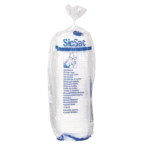 Deze SicSac spuugzakken of braakzakken gemaakt van duurzaam scheurbestendig polyethyleen in de kleur De overgeefzakken hebben een 11 cm grote eindring als mondstuk, met uitsparingen voor veilige bevestiging na gebruik.