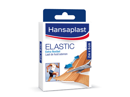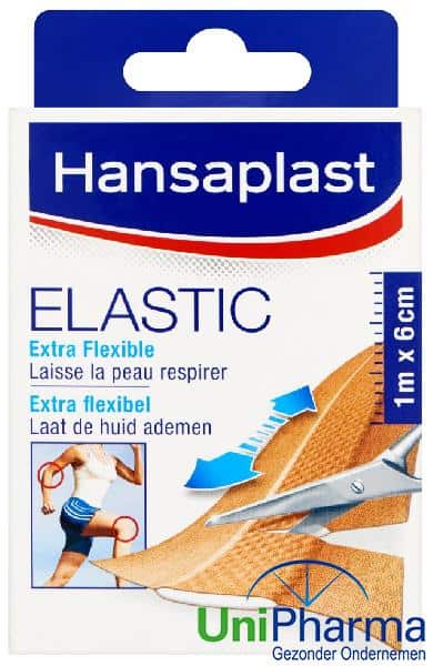 Hansaplast elastische 1 meter lange pleisterstrip in doosje verpakt. Verkrijgbaar in de breedte 6cm en 8 cm