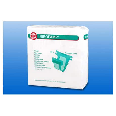 Luiers RIBOPAMPWegwerpluiers voor pasgeborenen en zuigelingen. De luier is voorzien van kleefband en wordt gekenmerkt door een goede pasvorm, is huidvriendelijkheid en heeft een hoog absorptievermogen.ย