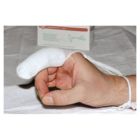 – Maat M betreft een procedureset en bevat naast het vingerverband ook 1 x een NOBATOPยฎ 8 5 x 5 cm 4-laags kompres.