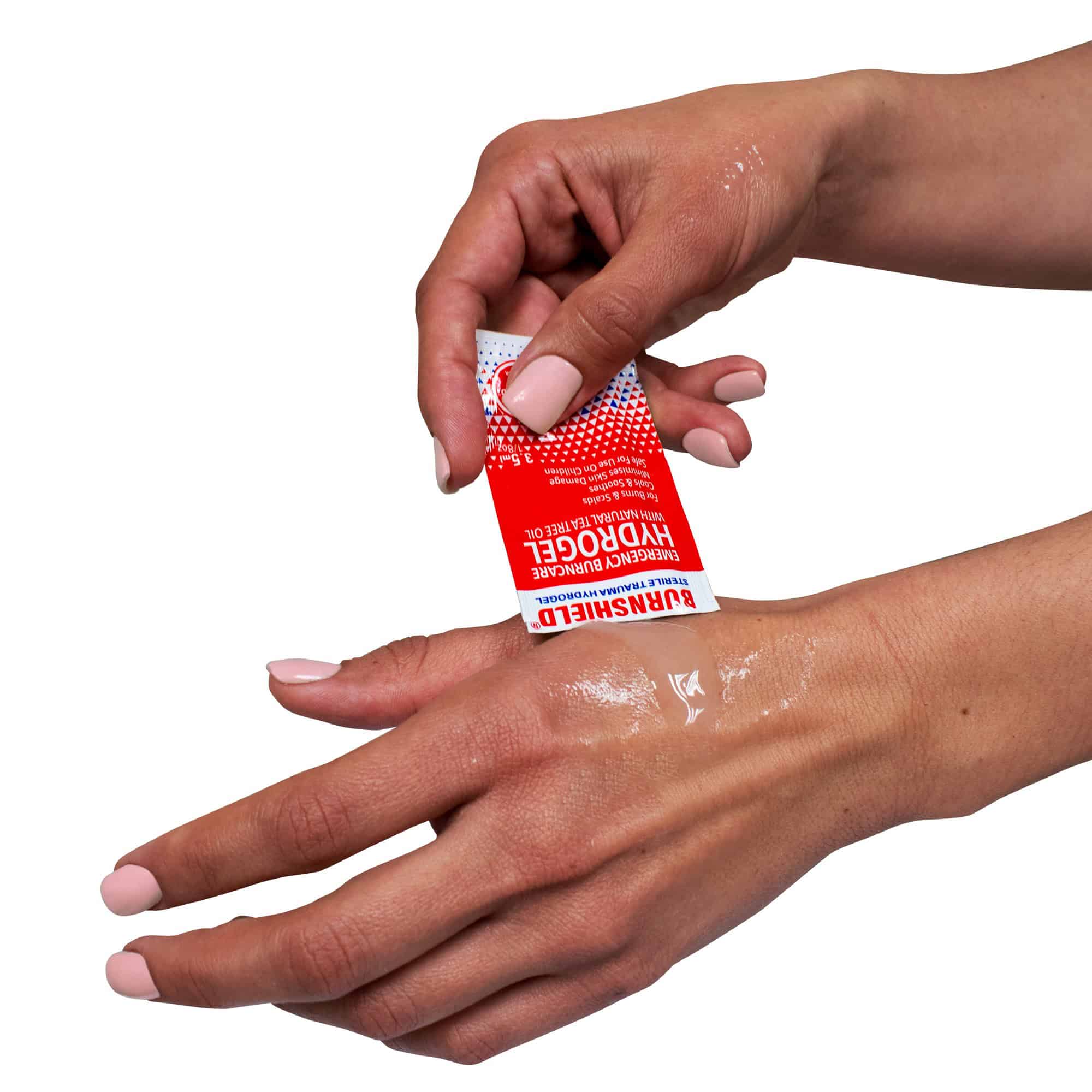 De steriele trauma-hydrogel kan worden gebruikt voor de eerste hulp bij brandwonden. Deze gel staat bekend om zijn vermogen om directe koeling en pijnverlichting te bieden bij het aanbrengen op een brandwond. De samenstelling is ontworpen om de huidtemperatuur te verlagen en weefselschade te verminderen. Het is non-stick en hecht zich niet aan de wond. De gel is niet giftig en niet irriterend en veilig te gebruiken bij kinderen.