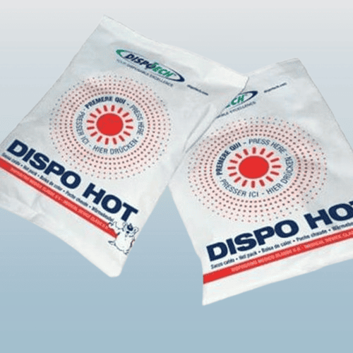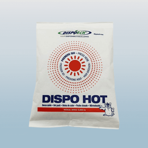 De Dispo Hot wegwerp hotpack, vervaardigd in non-woven stof (TNT), is een klasse IIa medisch hulpmiddel. De zak warmt onmiddellijk op na het indrukken van de luchtbel, wat aanleiding geeft tot een exotherm proces dat direct warmte afgeeft (c.a. 50ยฐC).
