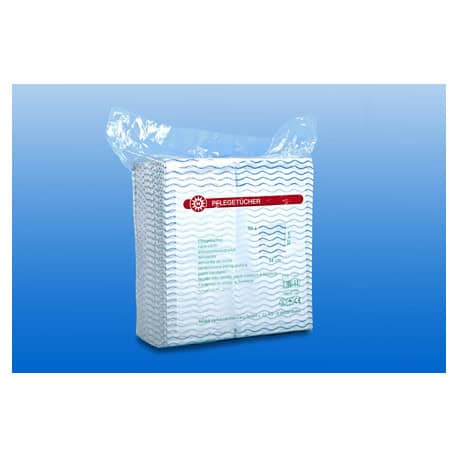 Blauw-witte, zacht absorberende doekjes gemaakt van non-woven (niet geweven) stof. De verzorgingsdoekjes zijn 32×34 cm groot en zijn gevouwen tot een handig formaat. De doekjes worden gebruikt om de verspreiding van ziektekiemen te voorkomen.